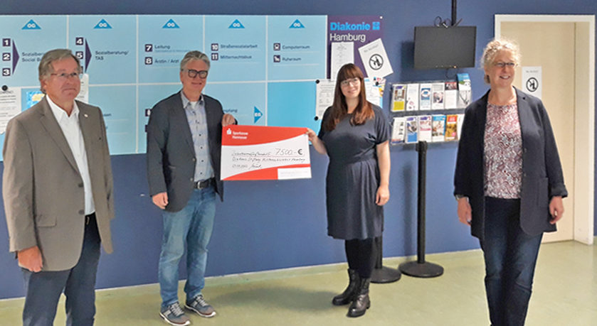 Peter Winter überreicht im Auftrag der Reichsbund Stiftung den Scheck über 7.500 Euro für das Hotelprojekt an die Diakonie Hamburg. Herr Klaus Wicher (v. li. n. re.), Landesvorsitzender SoVD Hamburg, Frau Melanie Mücher, Leiterin des Diakonie-Zentrums und Frau Jutta Fugmann-Gutzeit, Geschäftsführerin der Diakonie-Stiftung MitMenschlichkeit freuen sich über die Unterstützung.