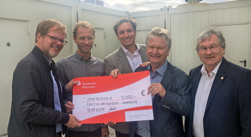 Am 19. September 2019 wurde ein Scheck über den Betrag von 10.000 Euro von der Reichsbund Stiftung für den Obdachlosenstützpunkt der Caritas in Hamburg überreicht. Klaus Wicher, 1. Hamburger Landesvorsitzenden Sozialverband Deutschland (SoVD), Julien Thiele, Sozialarbeiter Caritas Hamburg, Daniel Robionek, Leitung Immobilienmanagement, meravis Wohnungsbaugesellschaft, Peter Winter, Geschäftsführer Reichsbund Stiftung und Michael Edele, Hamburger Caritas Landesleiter am Obdachlosenstützpunkt im Münzviertel in der Innenstadt waren bei der Übergabe mit dabei (Foto unten links, v.l.n.r.)